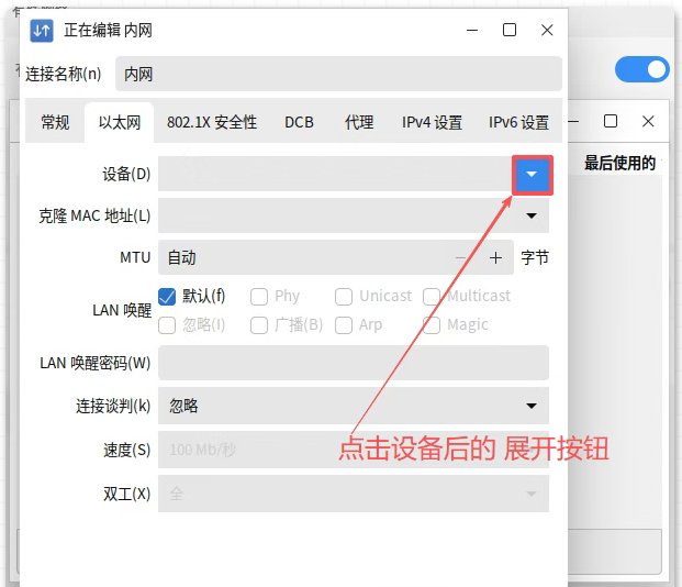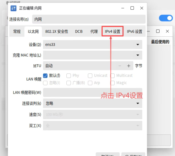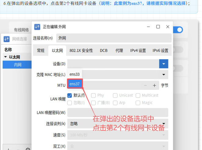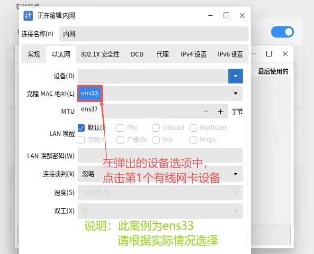9.在弹出的设备选项中,点击第1个有线网卡设备(说明:此案例为ens33,请根据实际情况选择);