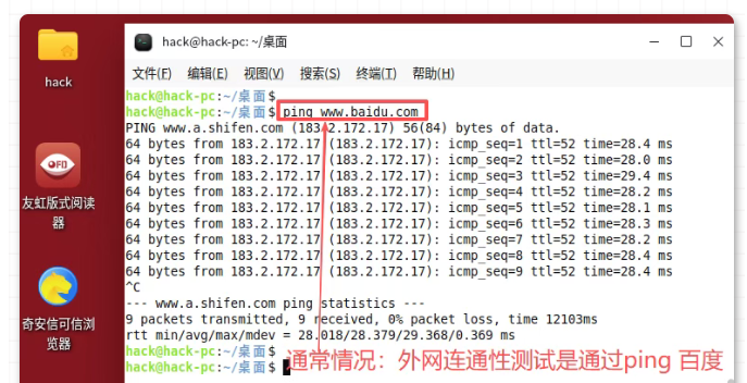 通常情况:外网连通性测试是通过ping 百度 (说明:本案例是ping www.baidu.com ,请根据实际情况修改)