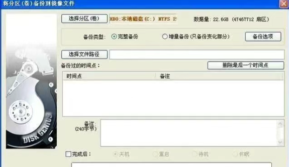 在迁移系统数据之前需要对原C盘做一个系统镜像的备份,详细操作步骤是:打开“DISKGEN软件工具”右键单击C盘选择“备份分区到镜像文件”,然后点击“选择分区”也就是C盘,勾选“完整备份”,选择系统镜像的备份存放路径,最后点击“开始”就可以了。