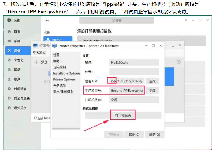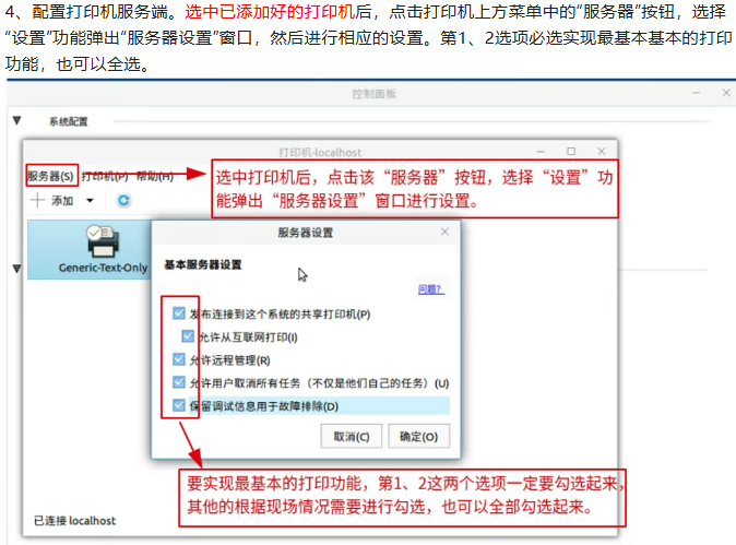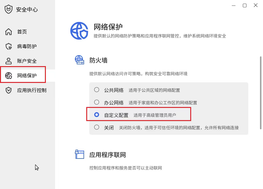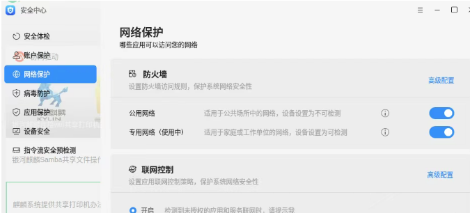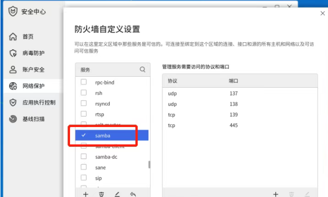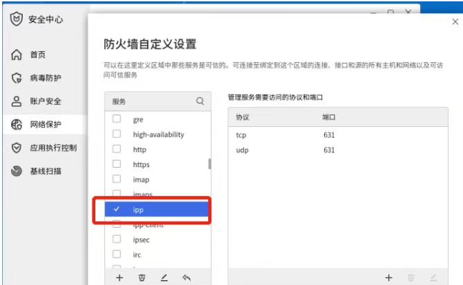 选择安全中心页面的【网络保护】选项,然后点击【自定义配置】按钮,找到ipp服务并勾选上,然后关闭安全中心应用。(若是将打印机共享给windows,则还需在“自定义配置”页面,勾选samba服务)