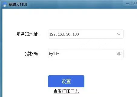 1、配置云打印的服务端,即打印云端,可以是Windows系统,选择一台连接好的打印机作为共享打印机,即云打印机。根据操作系统(Win7、Win10)安装云打印服务端,安装完成打开如下图界面:IP地址为Windows本机地址,授权码任意填写,点设置。,如下图所示: