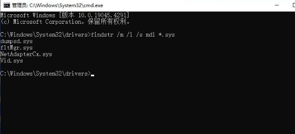 然后在该目录下打开CMD,输入[findstr /m /l /s mdl .sys],注意号前面有个空格!!!