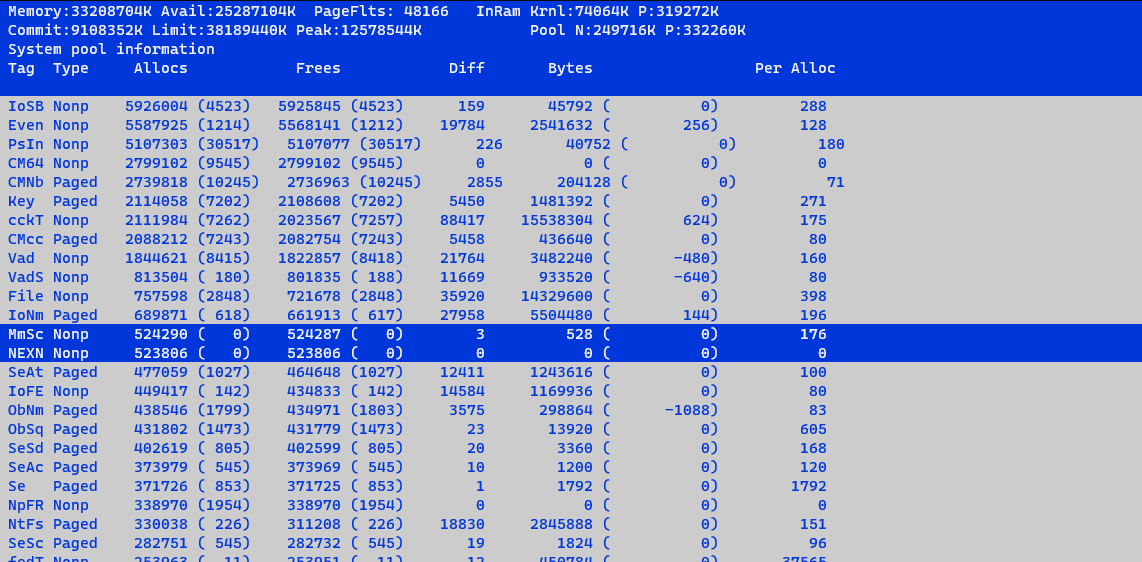 因为我们要找非分页池占用高的问题,所以按一下P键,Type就全部变为Nonp了。